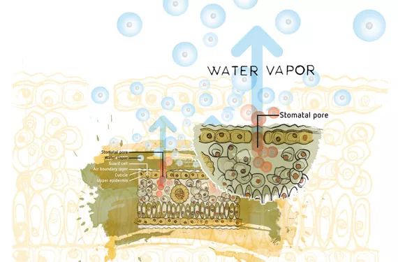 The relative humidity of the environment depends on temperature and wind speed. Higher temperatures generally lead to increased transpiration. This is partly because the molecules move faster, but warm air can also accommodate more water vapour. When there is no air movement, the air around the leaves will become saturated with water vapour, slowing down the process of evaporation. If the air is saturated with water, a film of water will condense on and around the leaves providing a good environment for pathogens, which can attack the plant.
